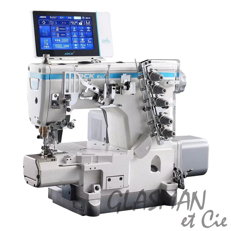 Machine à recouvrement bras canon entièrement numérique JACK K10+, contrôlée par écran tactile. La longueur de point est contrôlée numériquement et également le coupe-fil et le releveur de pied sont contrôlés par un moteur pas à pas, silencieux, précis et plus rapides. Accélération et décélération amélioré. Barre à aiguille lubrifiée. Machine multifonctionnelle : changez le kit et effectuez différents types de travaux comme les ourlets et les surpiqûres.