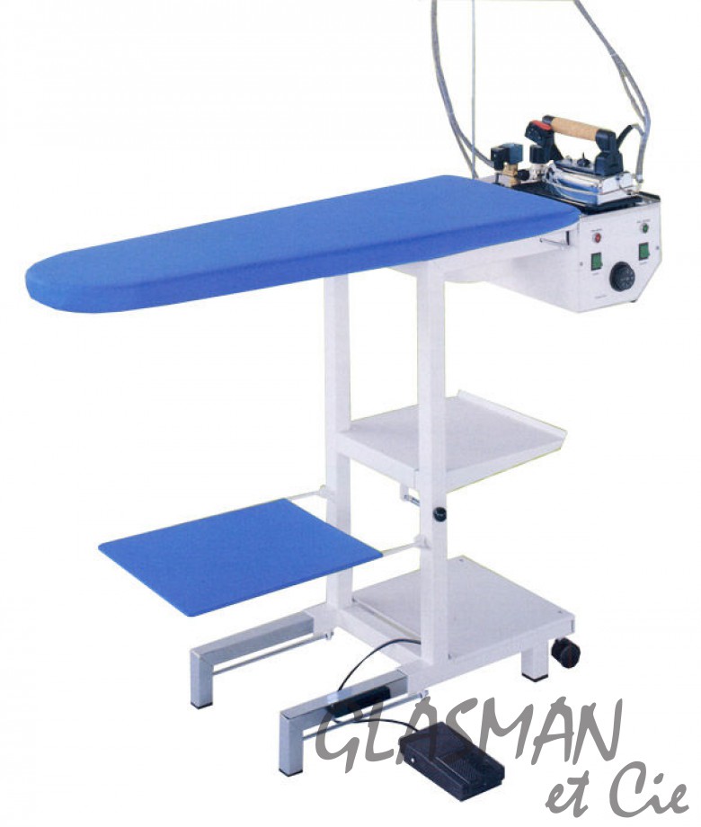 Table de repassage pointue pliante, chauffante et aspirante avec chaudière incorporée de 2L en cuve inox + Fer à industrielle Vidange